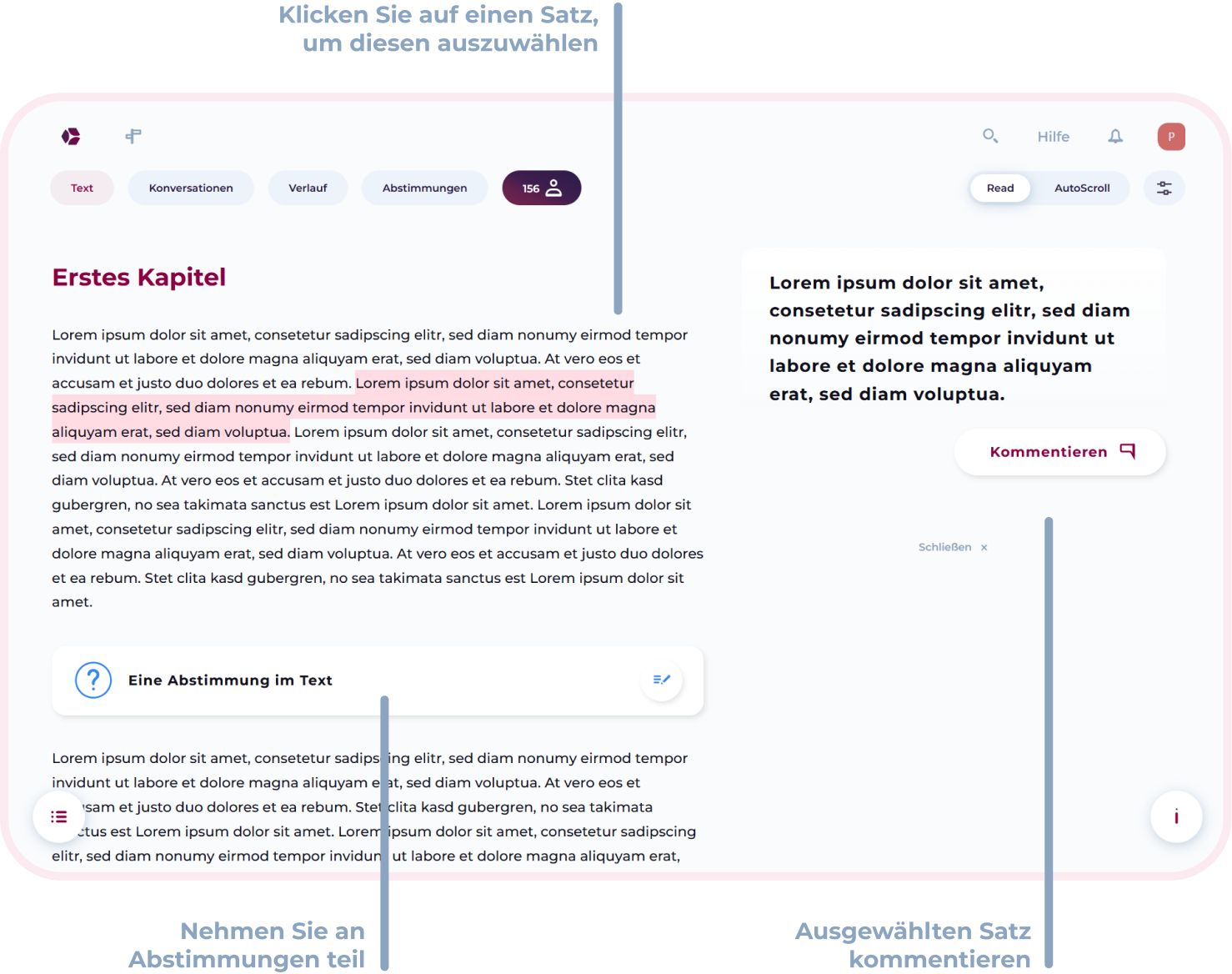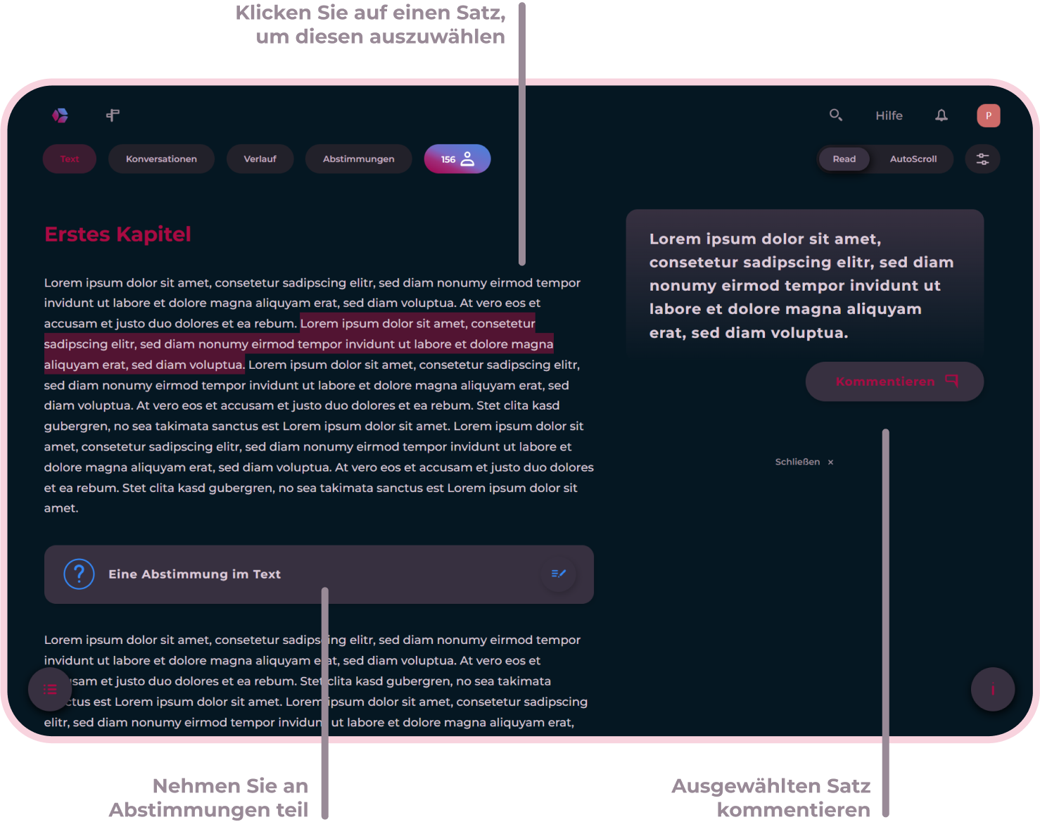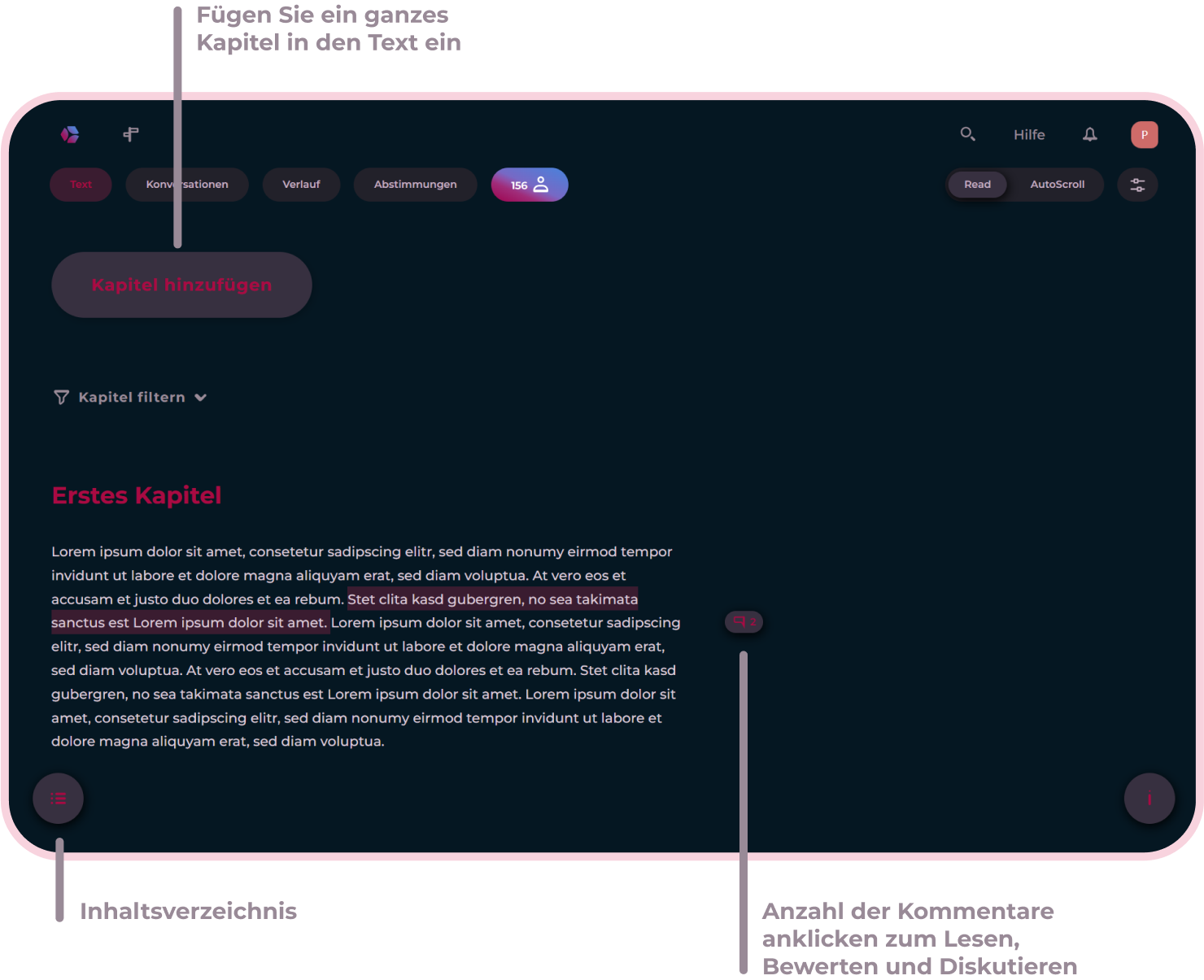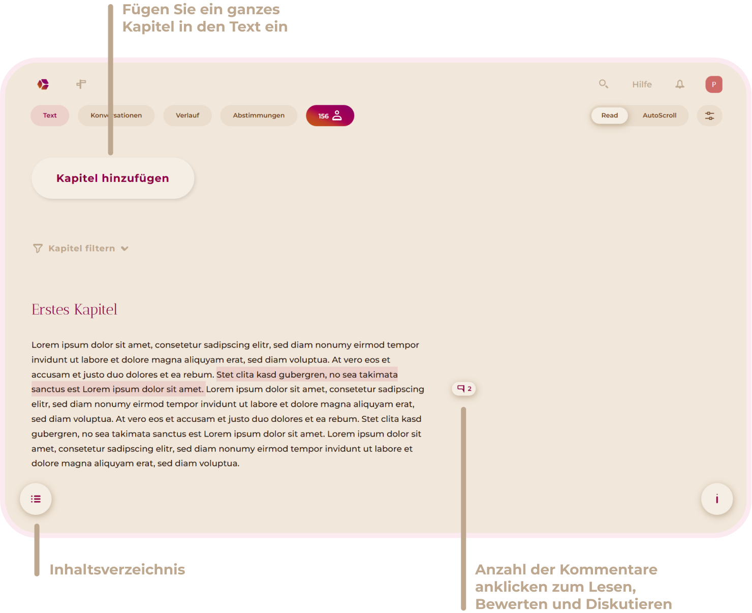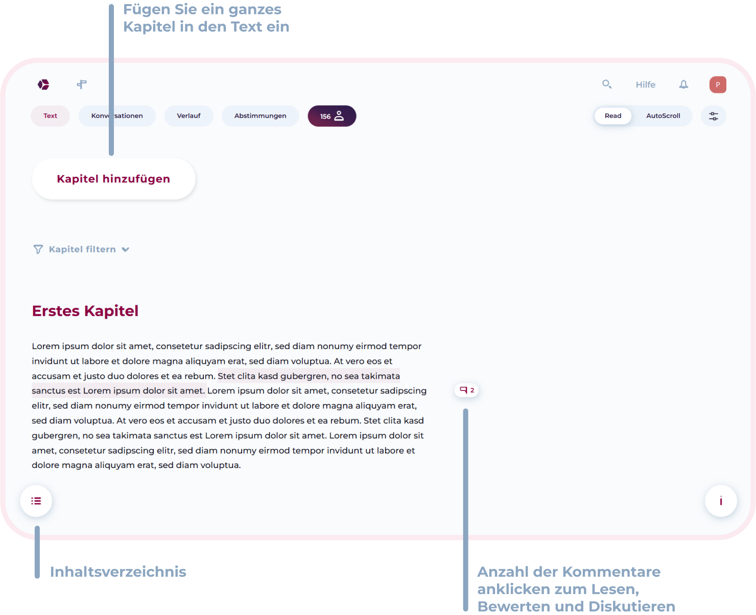 Hier erfahren Sie, wie Sie sich zurechtfinden, eigene Kapitel verfassen, Kommentare lesen und schreiben sowie aktiv mit anderen diskutieren können.