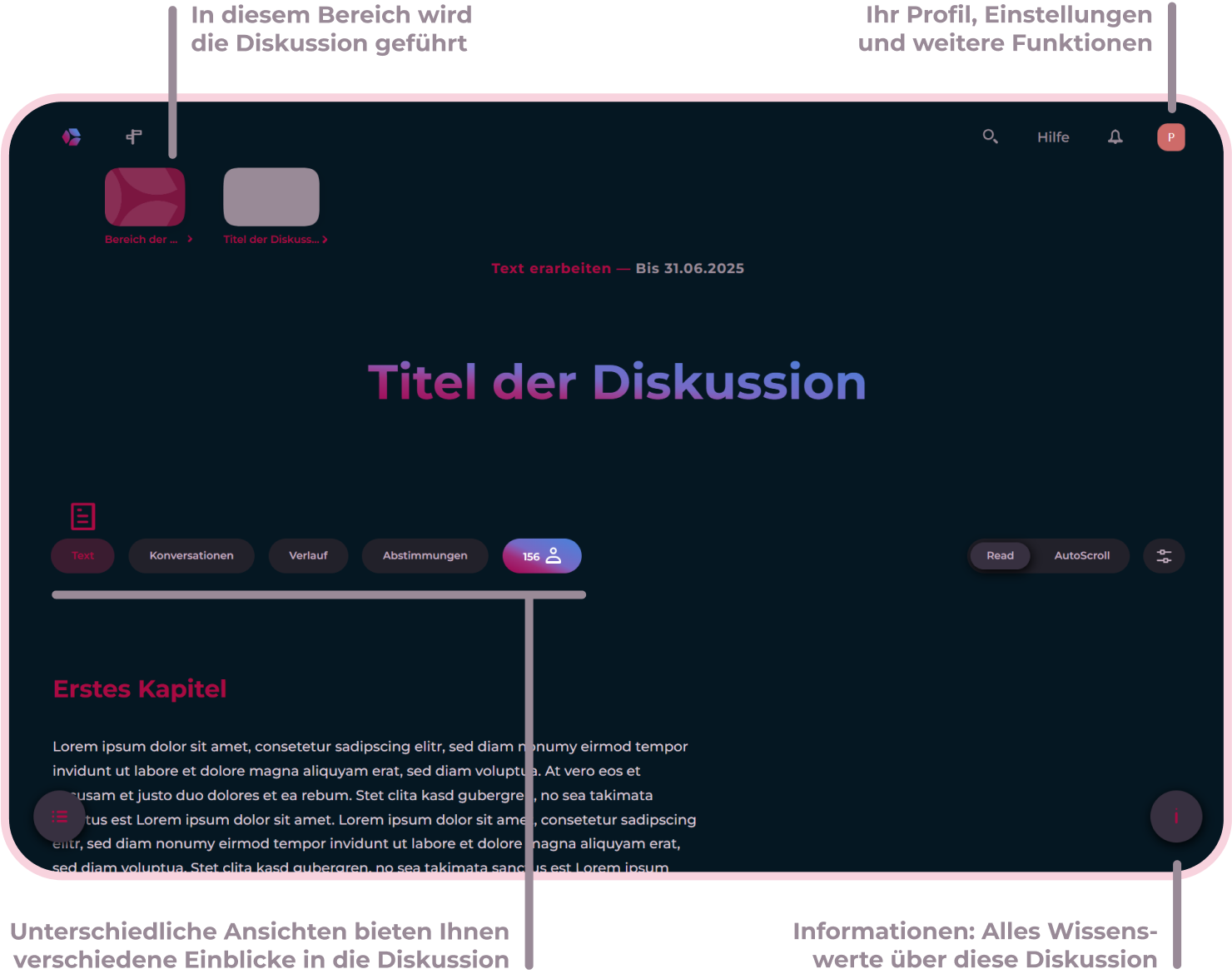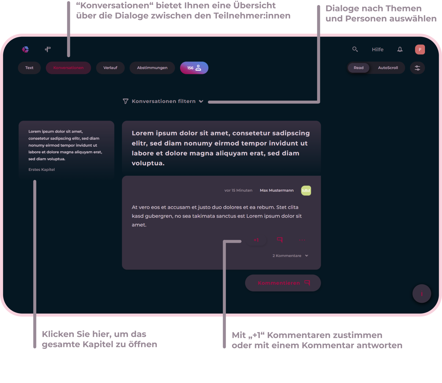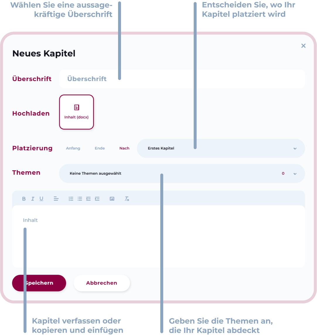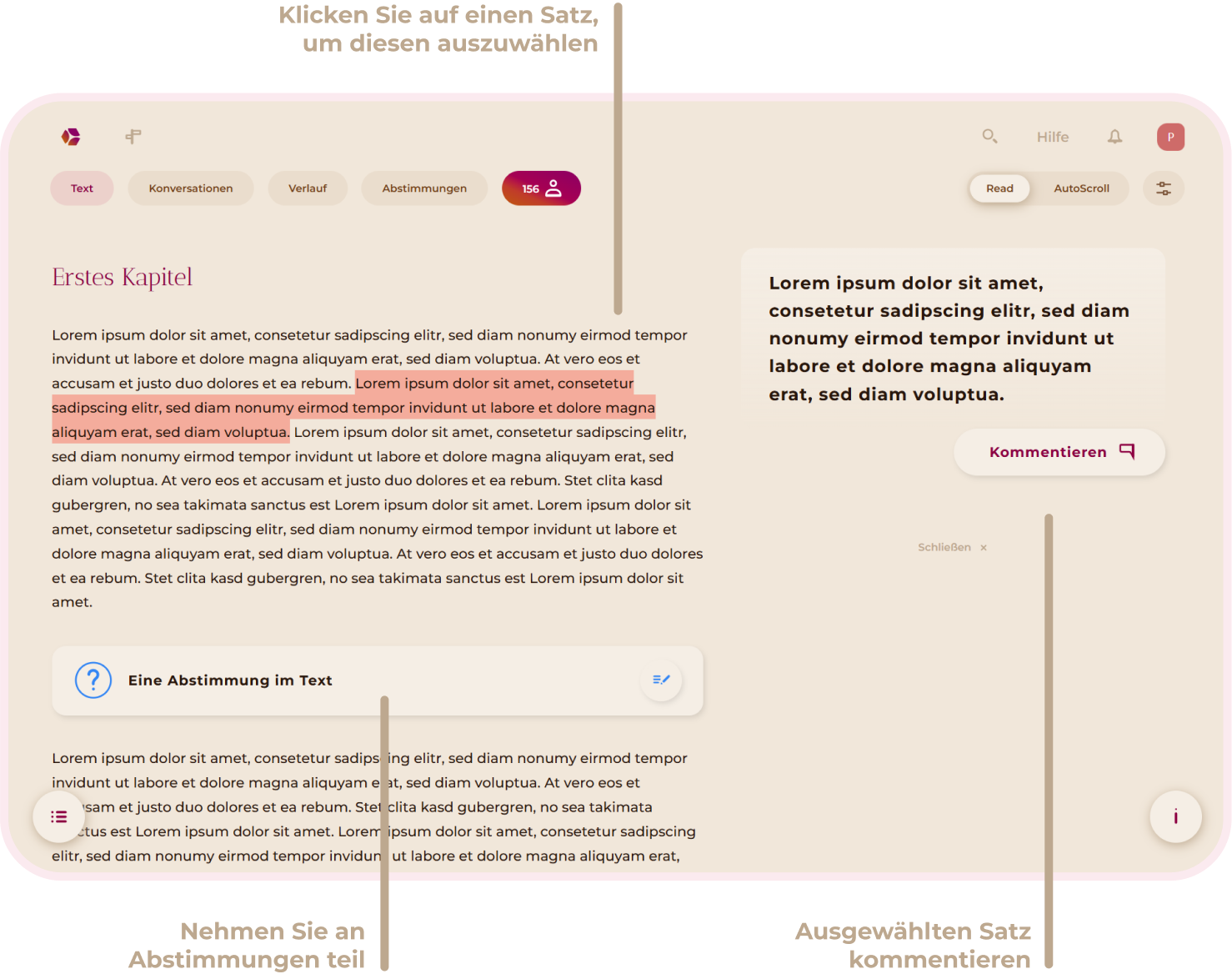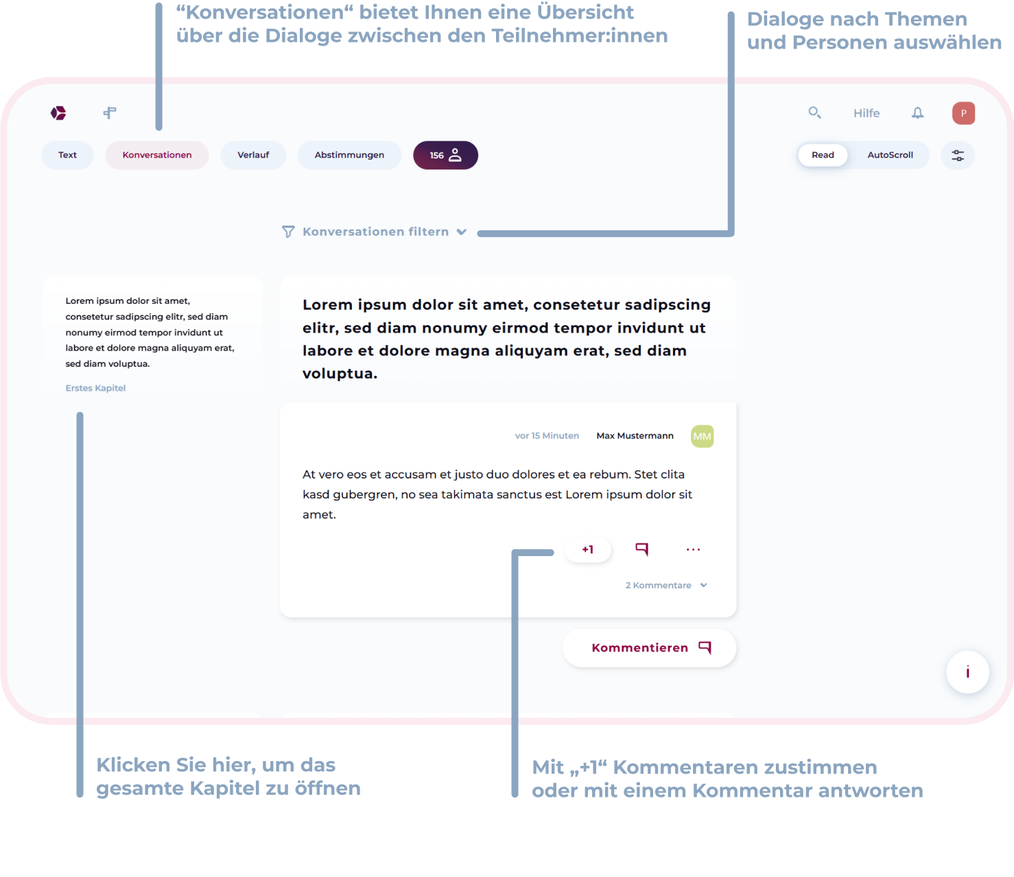 Hier erfahren Sie, wie Sie sich zurechtfinden, eigene Kapitel verfassen, Kommentare lesen und schreiben sowie aktiv mit anderen diskutieren können.