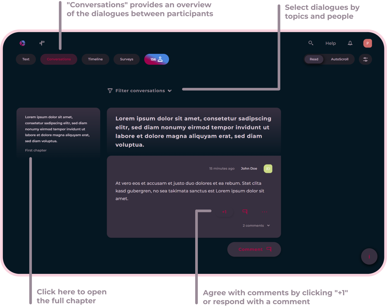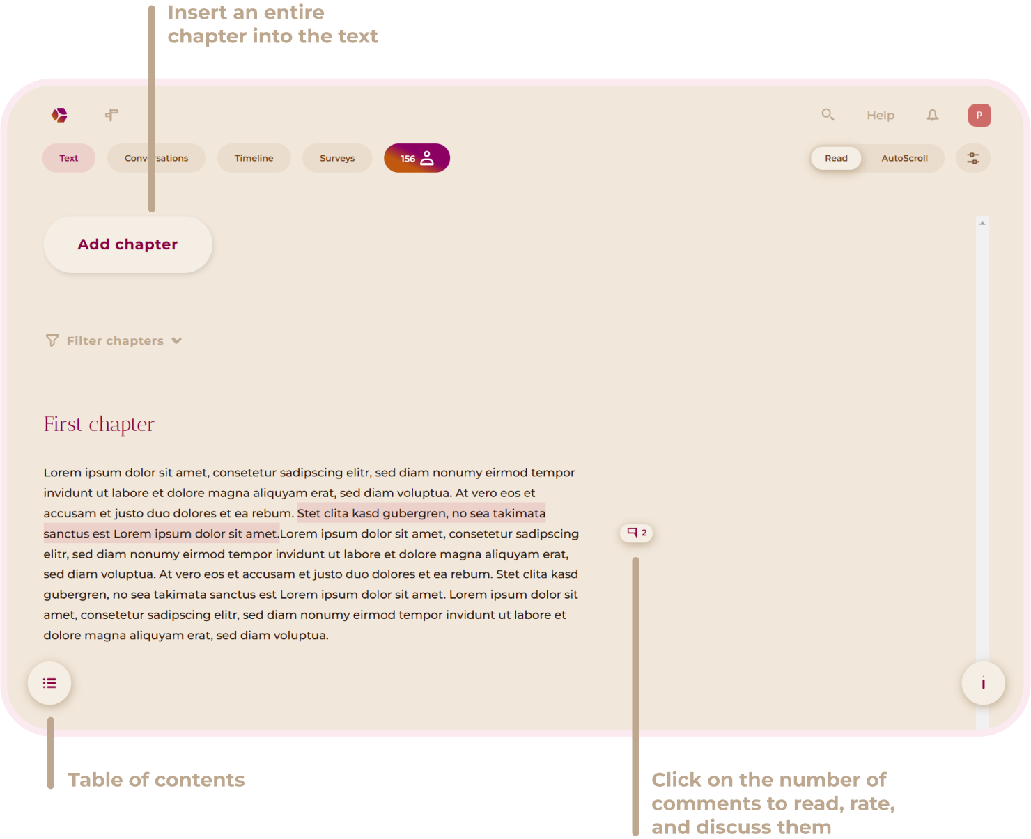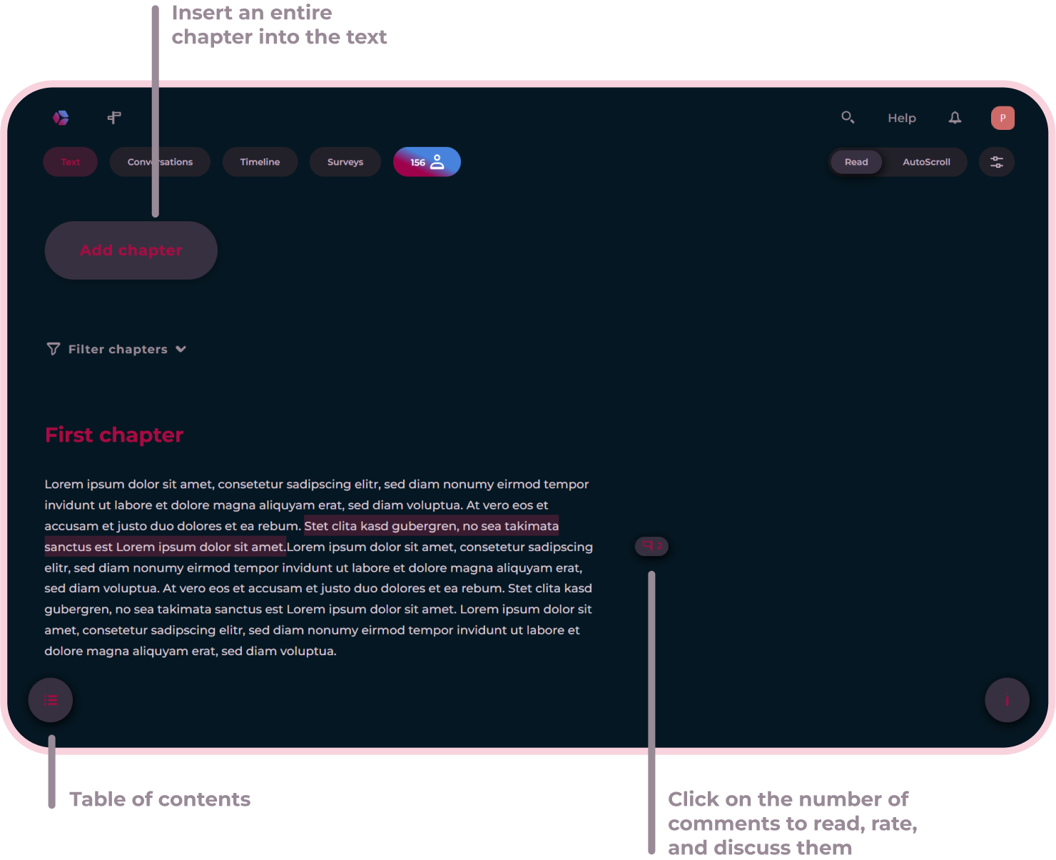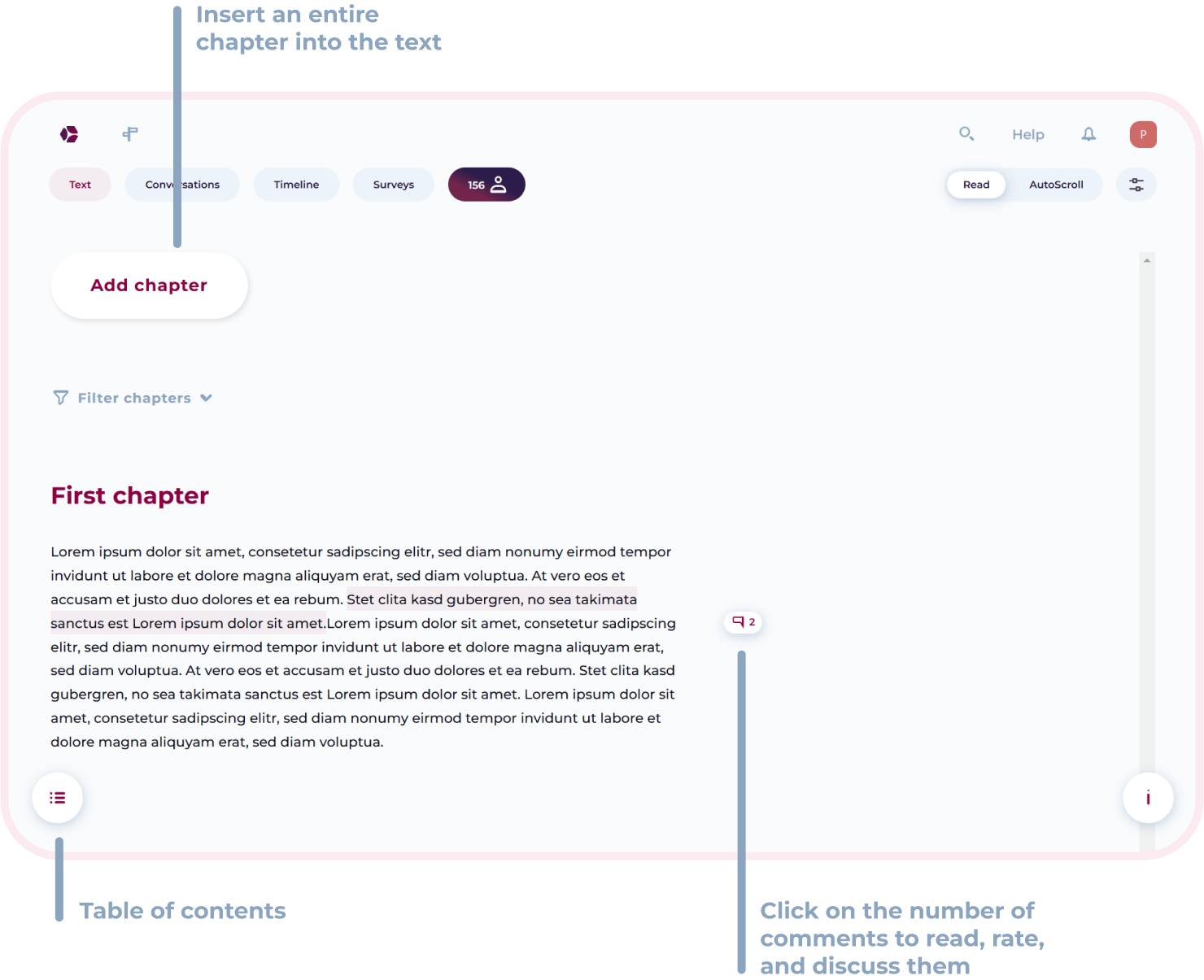 Here you will learn how to navigate, write your own chapters, read and write comments, and actively engage in discussions with others.